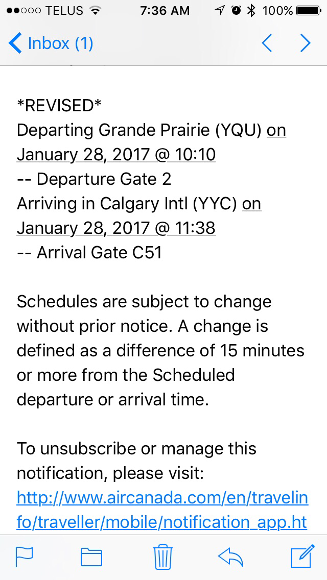 I checked my phone when I got up and there was an email from Air Canada saying that the flight that we were supposed to take this morning out of Grande Prairie was delayed and would not get to Calgary until 11:40am, 25 minutes after our flight to Toronto would have left. My intuition paid off in this case and the $200 for the hotel in Calgary was worth every penny.