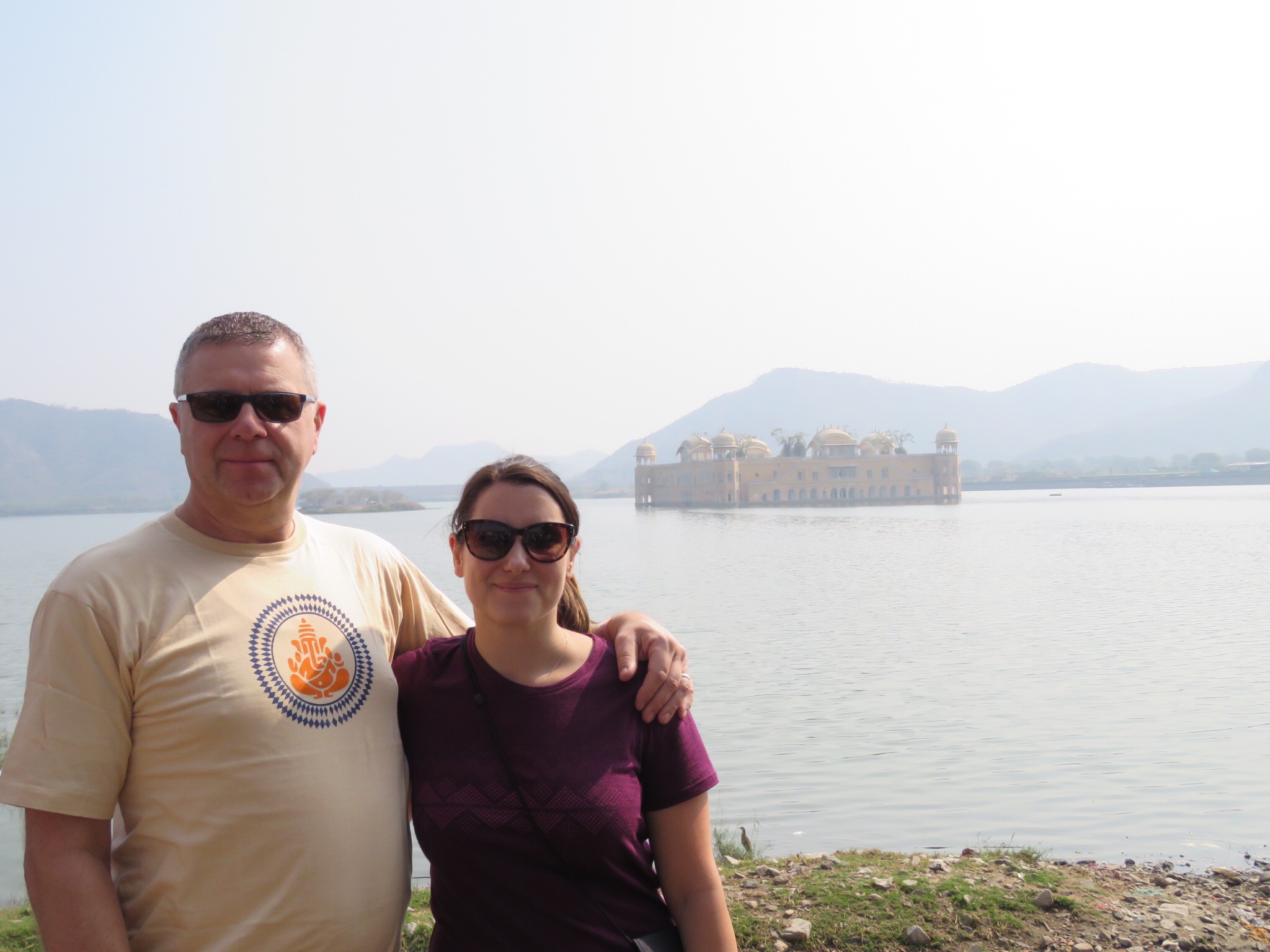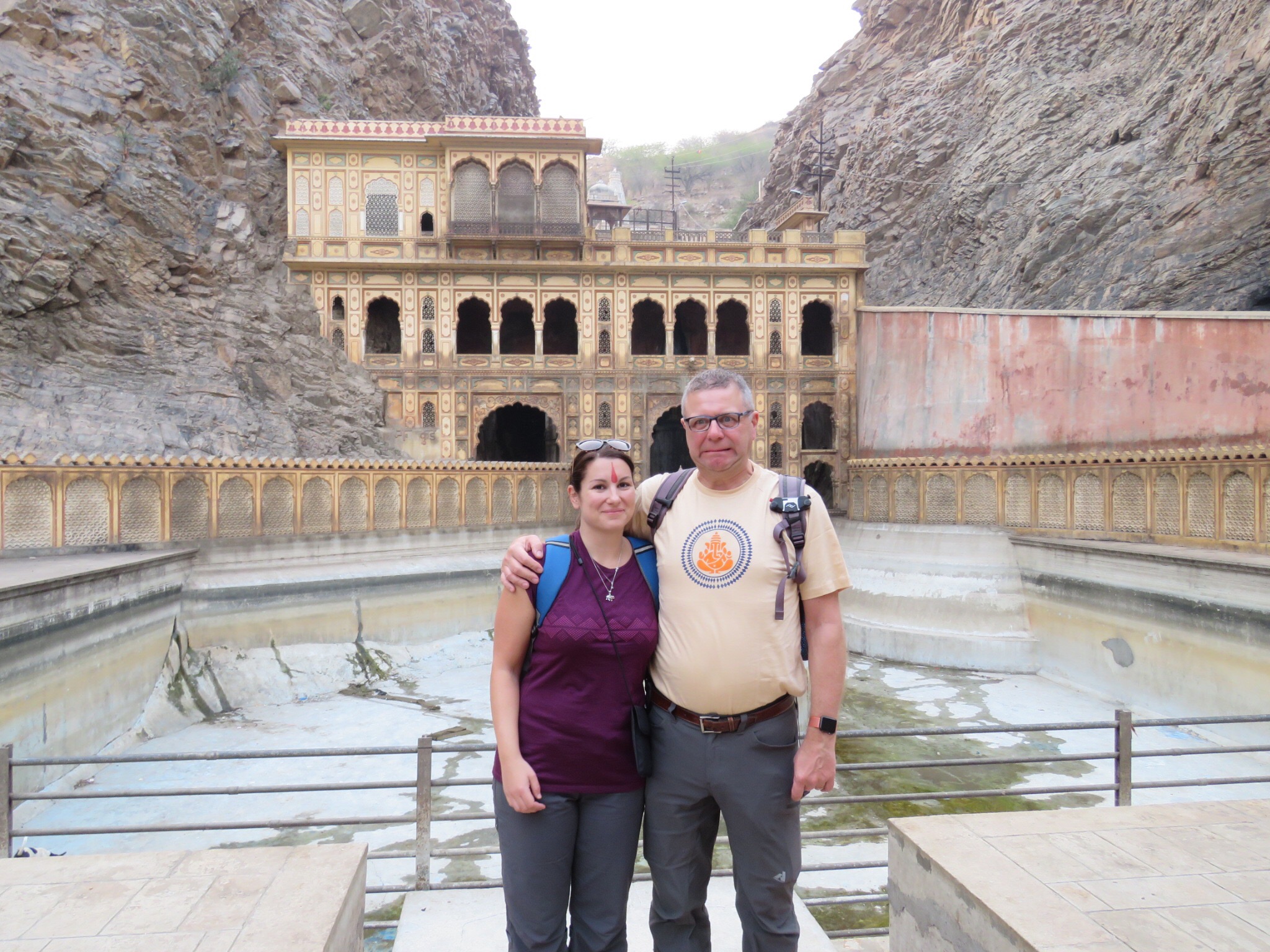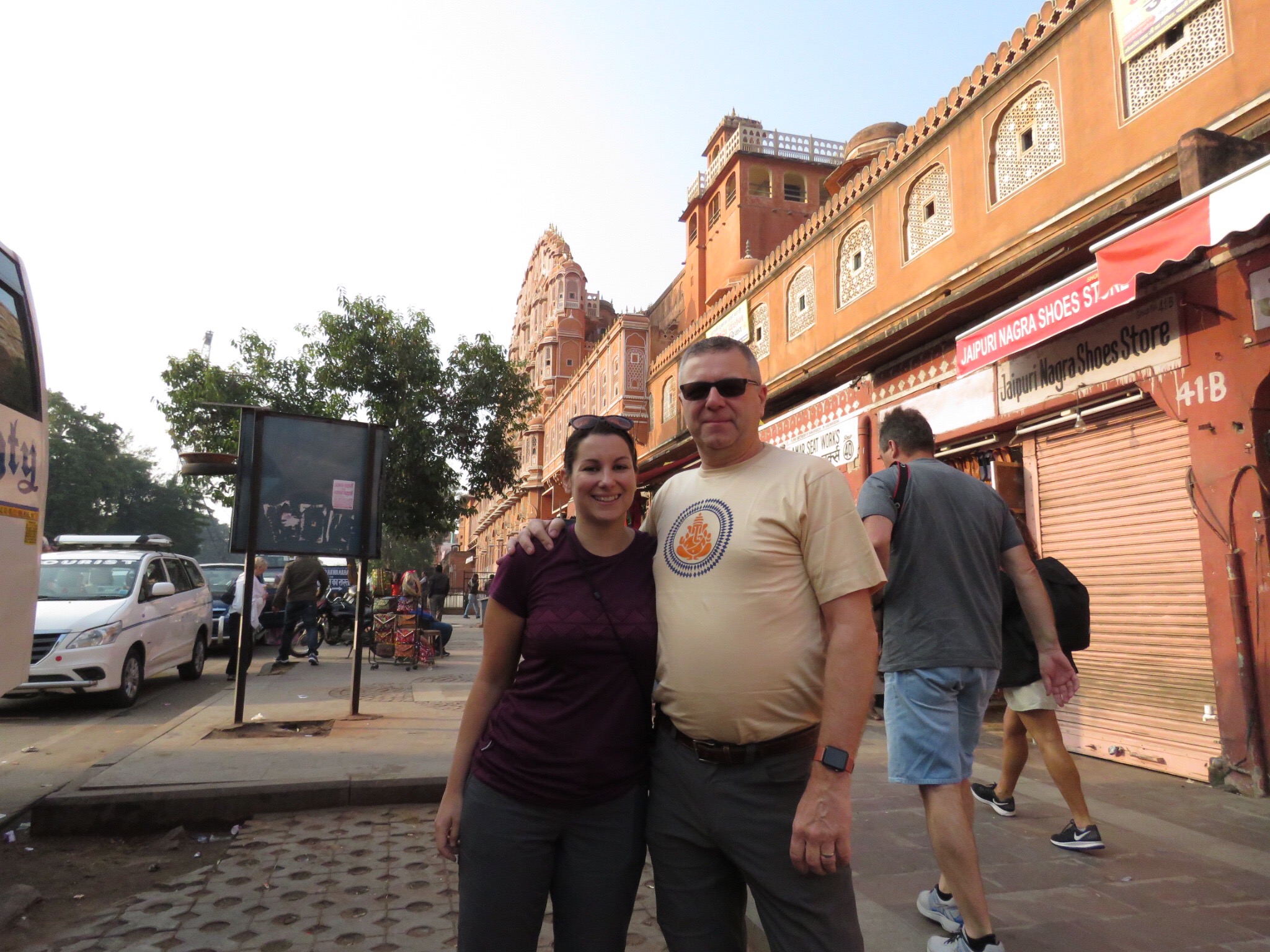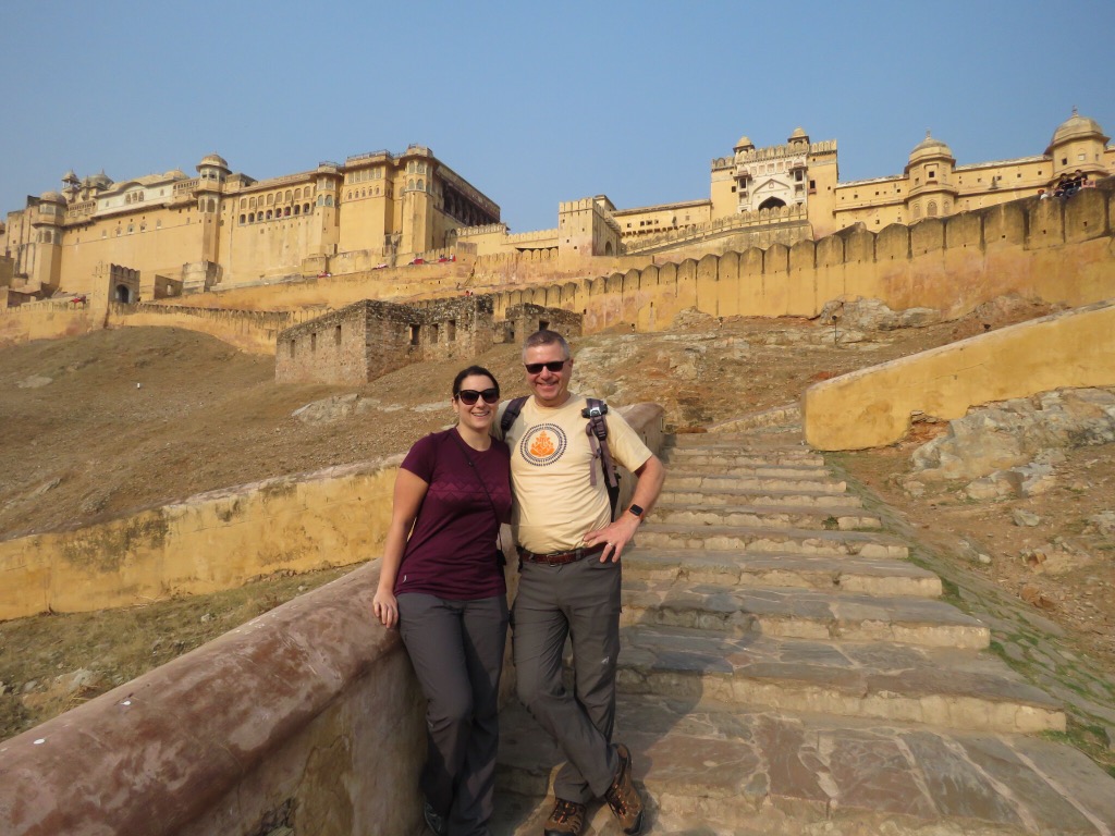 We were supposed to be up at 5 to go for a hot air balloon ride, but it was cancelled due to the weather. Instead we were out by 8. We visited the Amber Fort, but on the way we stopped at the Palace of the Winds for a photo opportunity. That’s it in the background behind us..