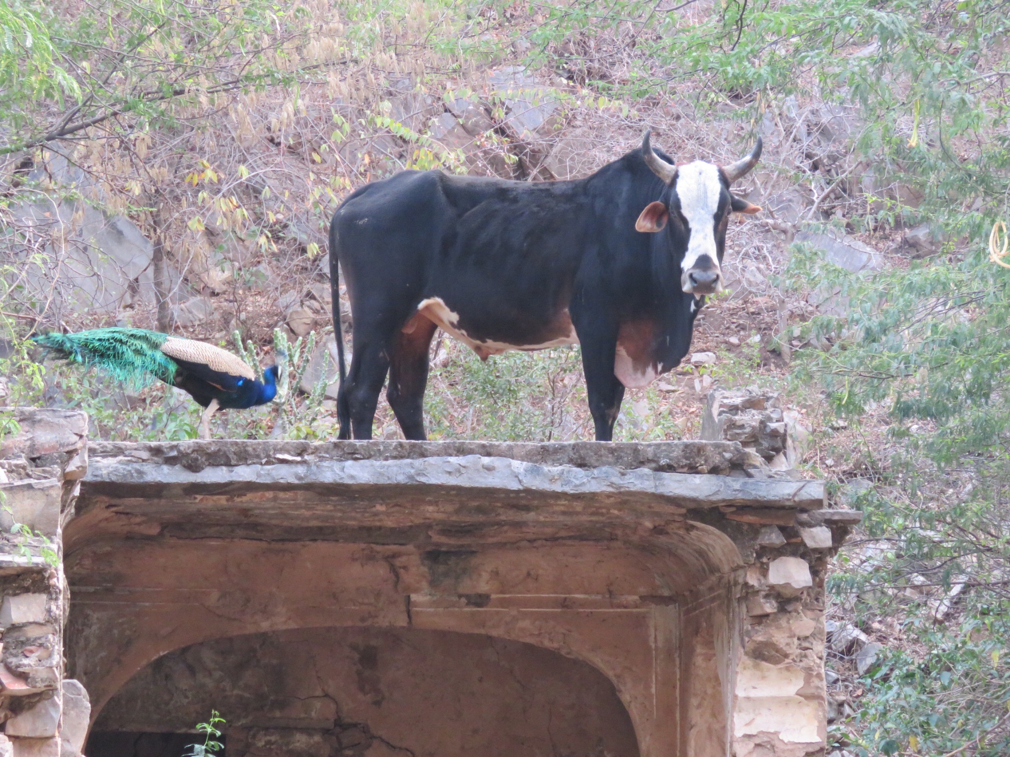 We got back to the hotel with only 30 minutes to spare before we were off to the Monkey Temple. We quickly made our way to the hotel bar for a beer before we had to go. Our CEO arranged auto rickshaws for the 8 of us who wanted to go. It was maybe a 20 minute ride there and back, which cost us $14 per rickshaw. This particular monkey temple was featured in at least one documentary, which I had seen before, so it was pretty cool being there. Once there, we had to pay $1 each to be able to take pictures. It was really quiet, we were basically the only ones there. Here is a cow and a peacock.