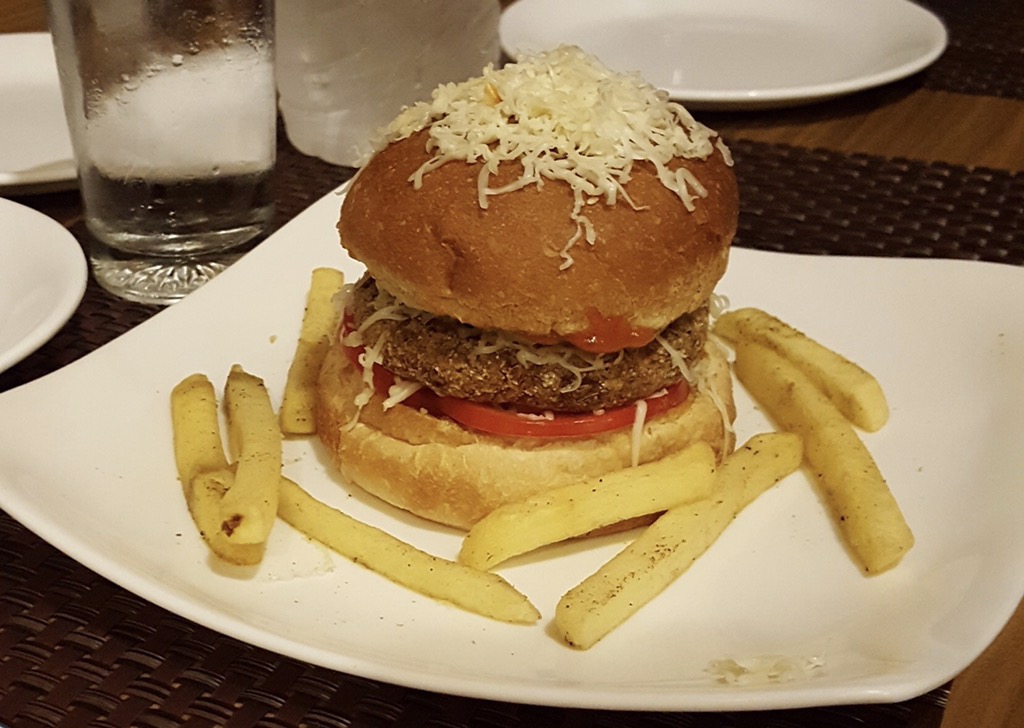 We went to dinner at what seemed to be the most popular restaurant in Varanasi. There were people lined up outside to get in, just like we see at home. We had a stuffed mushroom masala, which was delicious. Our new friend Jim ordered a cheeseburger (veggie burger with cheese) an it was worth a photo: