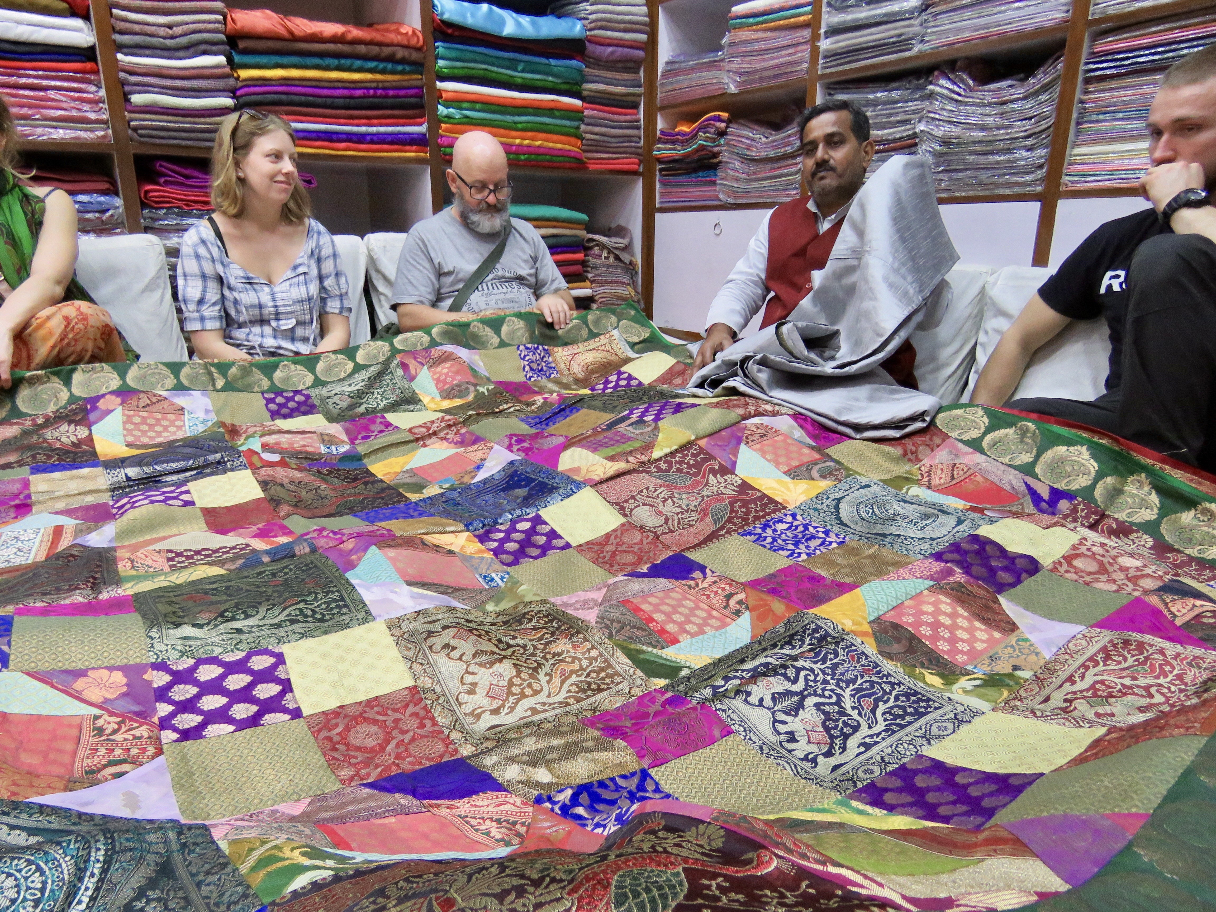 We were then taken to the sales room where we sat in a circle on a floor covered in what seemed like futons. The salesman really wanted us to know what was real silk or cashmere and what wasn’t, and how to tell (set a flame to it and smell it, if it smells like burnt hair, it’s real. Also how fast it burns …cotton burns quicker). He showed us duvet covers, shawls, scarves, and saris. We spent a lot of money there, let’s just leave it at that.