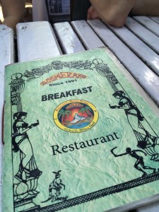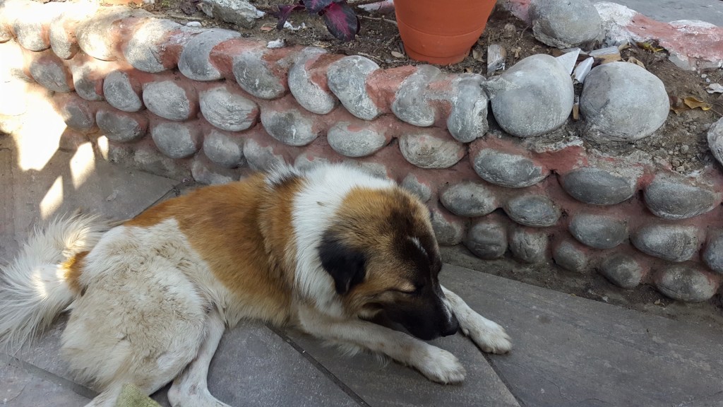 Next, we had some time to eat (thank goodness because we were ravenous) prior to our planned paragliding activity. We chose a German Bakery we saw the night before. A dog followed us into the outdoor restaurant and sat there with us while we ate, and even most of the walk back to the hotel. Lots of dogs in downtown Pokhara, but no cows or goats.
